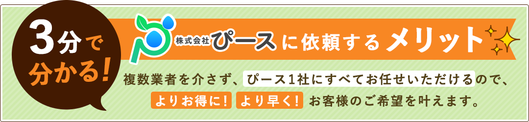 株式会社ぴースでは、遺品整理から解体工事までをワンストップサービスでご提供できます!複数の業者にそれぞれ依頼するよりも、よりお得に、よりスピーディーにお困り事を解決いたします。一つずつ、誠実に分かりやすくお伝えいたしますのでお気軽にご依頼・ご相談ください!
